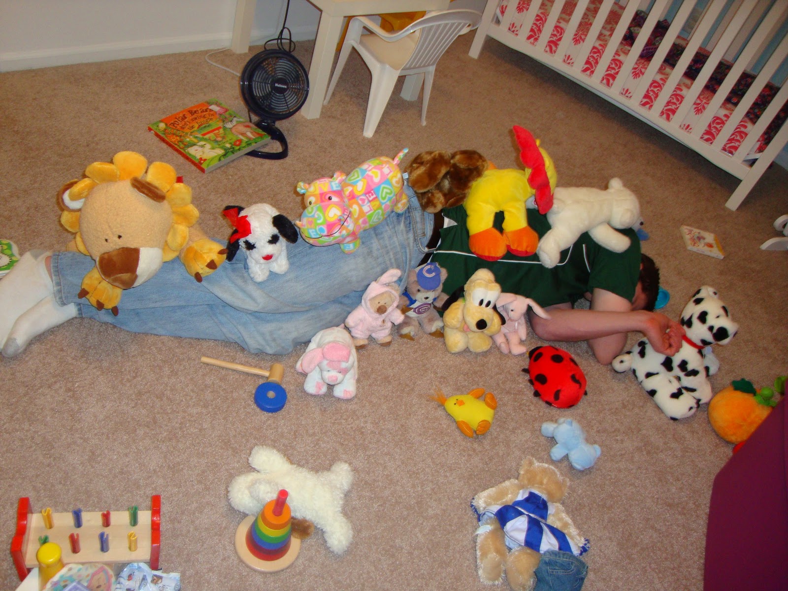 She has been doing this a little lately, and usually we just give her a minute and she calms down and goes back to sleep. This is good, because if we go in there, she is wide awake and ready to play after a long "nap". So she wakes up and doesn't stop crying . . . for 45 minutes. Finally, her screaming turns frantic, so I go up there leaving all the lights off just to make sure a limb isn't stuck or that her lip didn't split back open (again . . . ). Nope. I find her standing in her crib, face soaked in tears, reaching down to the dishtowel she had dropped on the floor. I gave it back to her and she snuggled it tight. I rocked her, then put her back in her crib. She rolled over and went right to sleep.